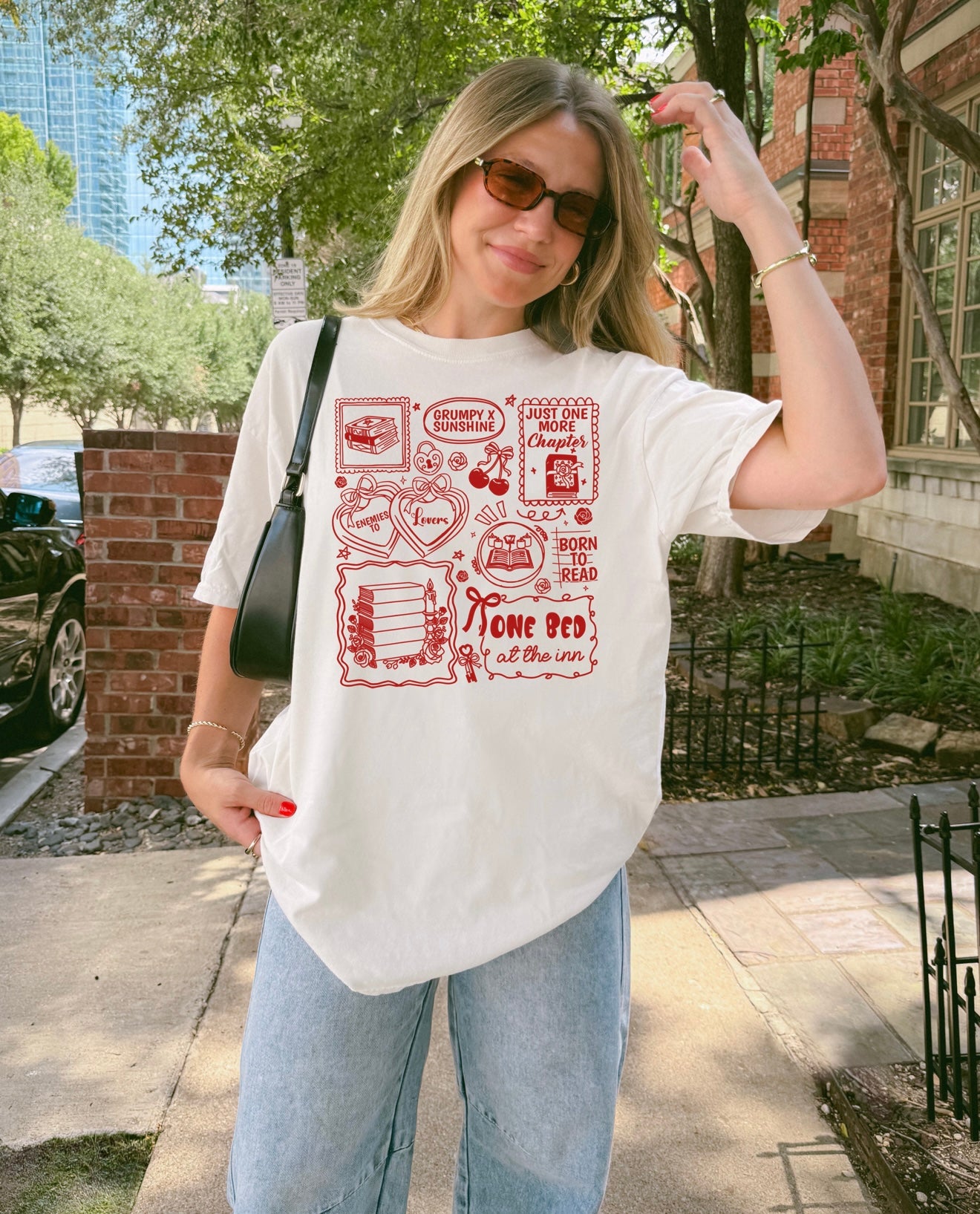 Wear your favorite stories on your sleeve (literally)! This oversized graphic tee celebrates all the best bookish tropes – from Grumpy x Sunshine to One Bed at the Inn. Printed in bold red ink on a comfy white cotton base, it’s the perfect outfit for cozy reading sessions, bookstore runs, or just letting the world know you’re “Born to Read.”