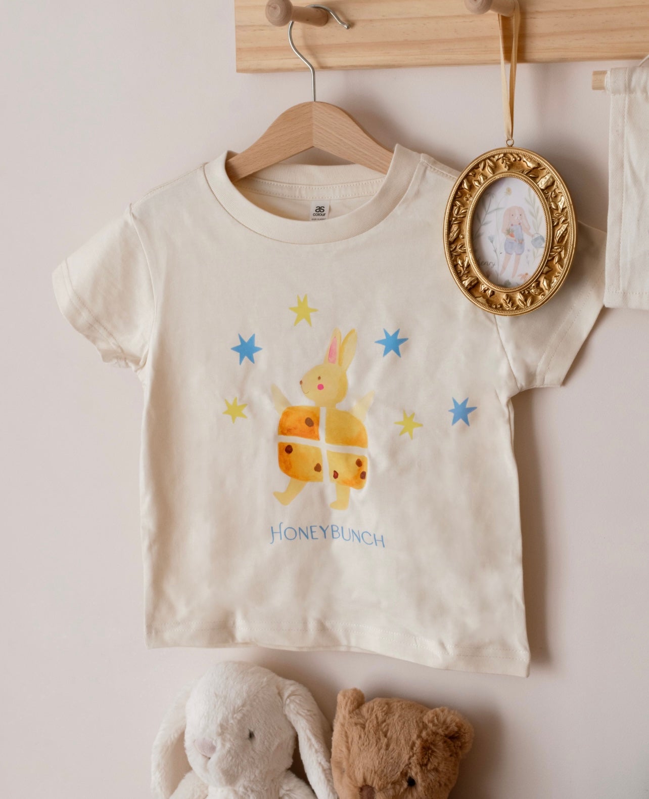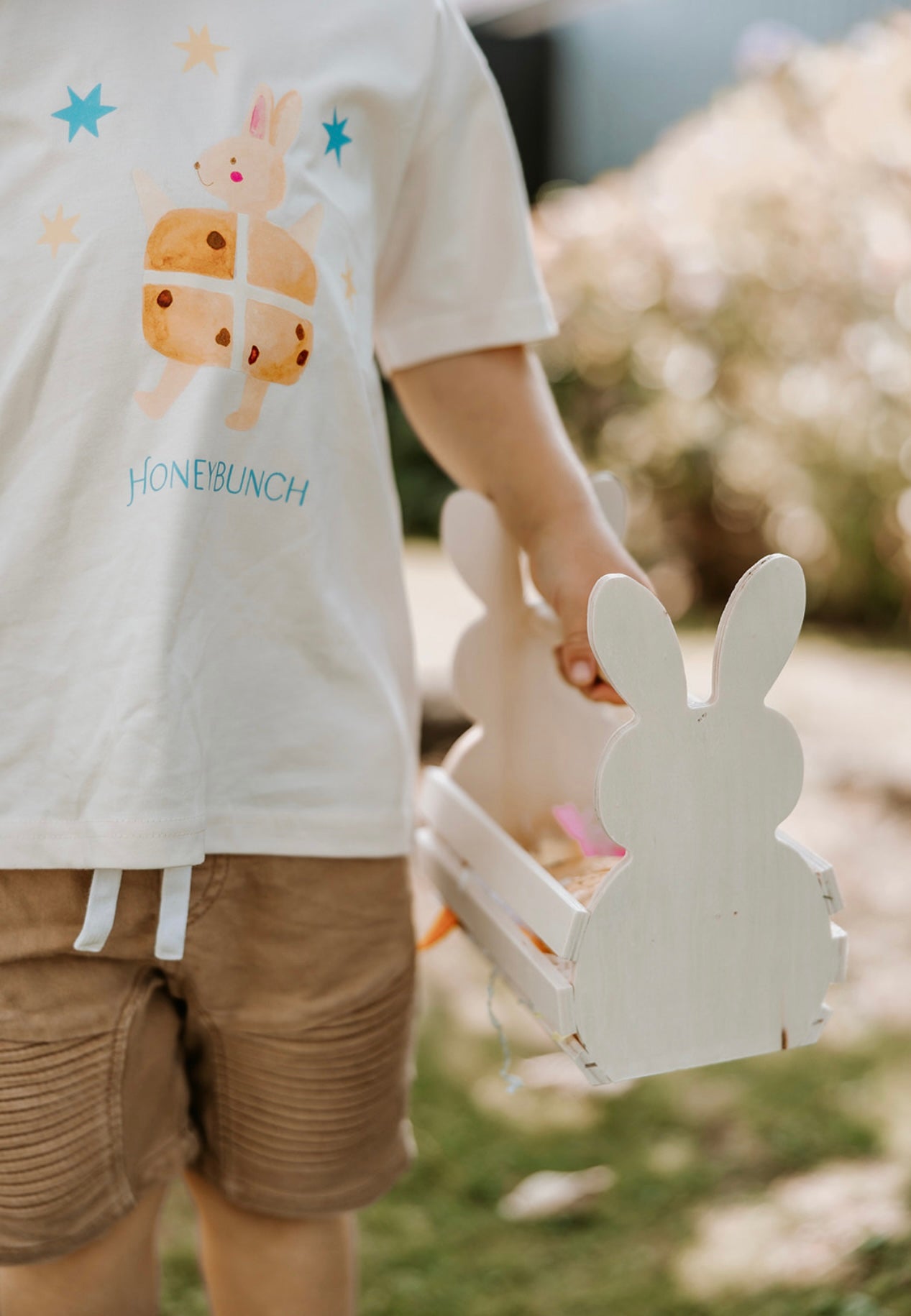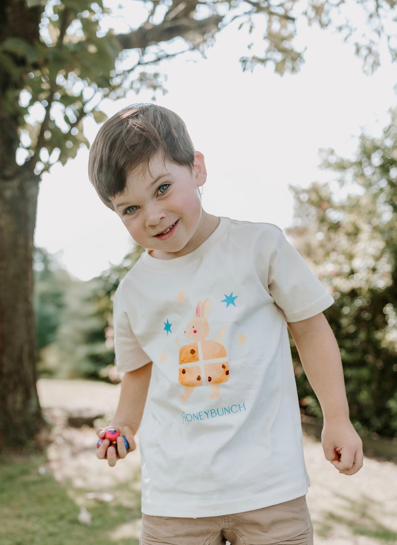 The sweetest twist on an Easter classic has arrived 🐰✨ Meet our Hot Cross Bunny tee – a hand-drawn design created exclusively for Honeybunch by New Zealand artist Stardust and Whimsy.