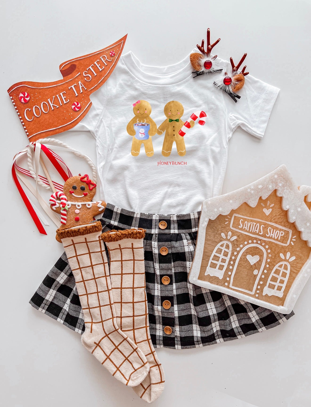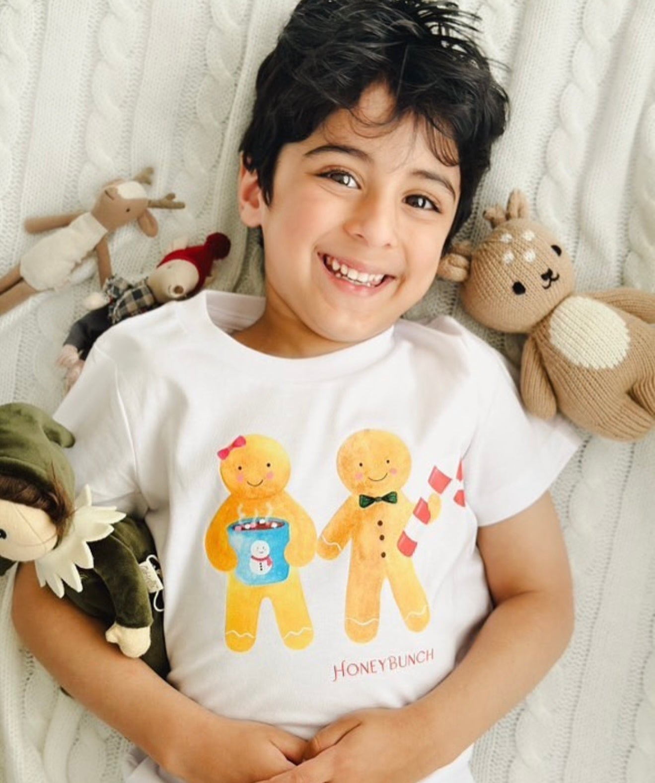 Meet the sweetest pair in town — our cheerful Gingerbread Duo, fresh from the Honeybunch oven! These two cuties are ready to sprinkle Christmas magic wherever they go — holding candy canes, hot cocoa, and big smiles. Made for little dreamers and cookie lovers alike, this tee brings all the cozy, festive feels.